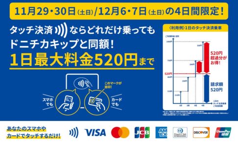 札幌市営地下鉄でタッチ決済の上限運賃キャンペーンを実施 11/29,30と12/6,7の土日4日間限定 1日の上限となる料金は520円(ドニチカキップと同額) 上限運賃は自動的に適用(事前登録は一切不要) …