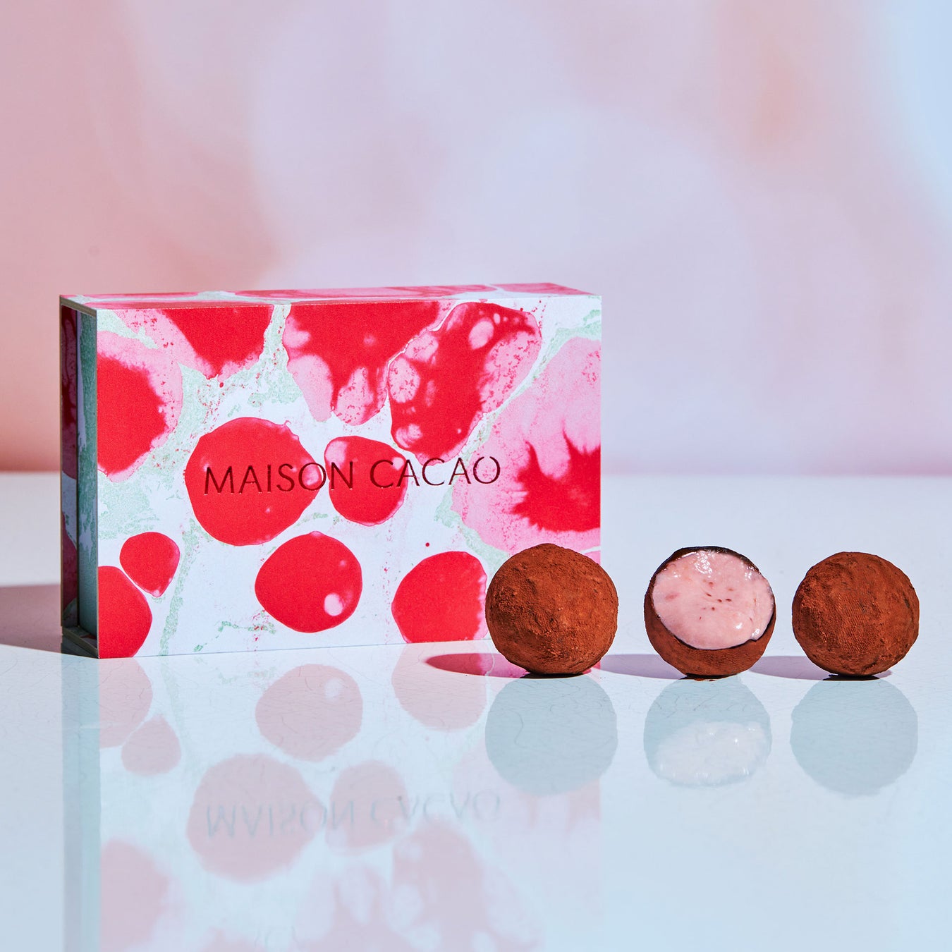 外側のチョコレートは少し力を入れただけで割れそうなほど繊細ながら、口の中でパリッと弾けた瞬間に、中から液状のチョコレートが溢れ出します。それは出会ったことのない、驚きに満ちた体験。生チョコレートならではの食感、水分量、香りと味わいが表現された一粒をそっと指でつまんで、お召し上がりください。
