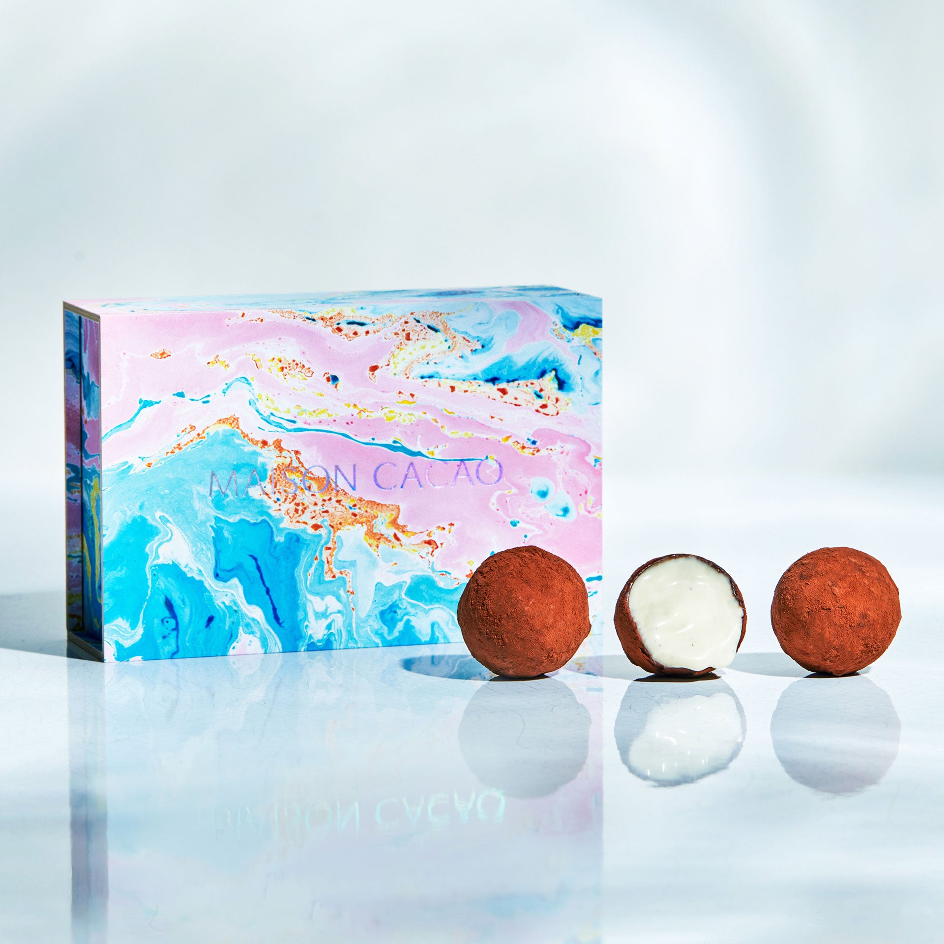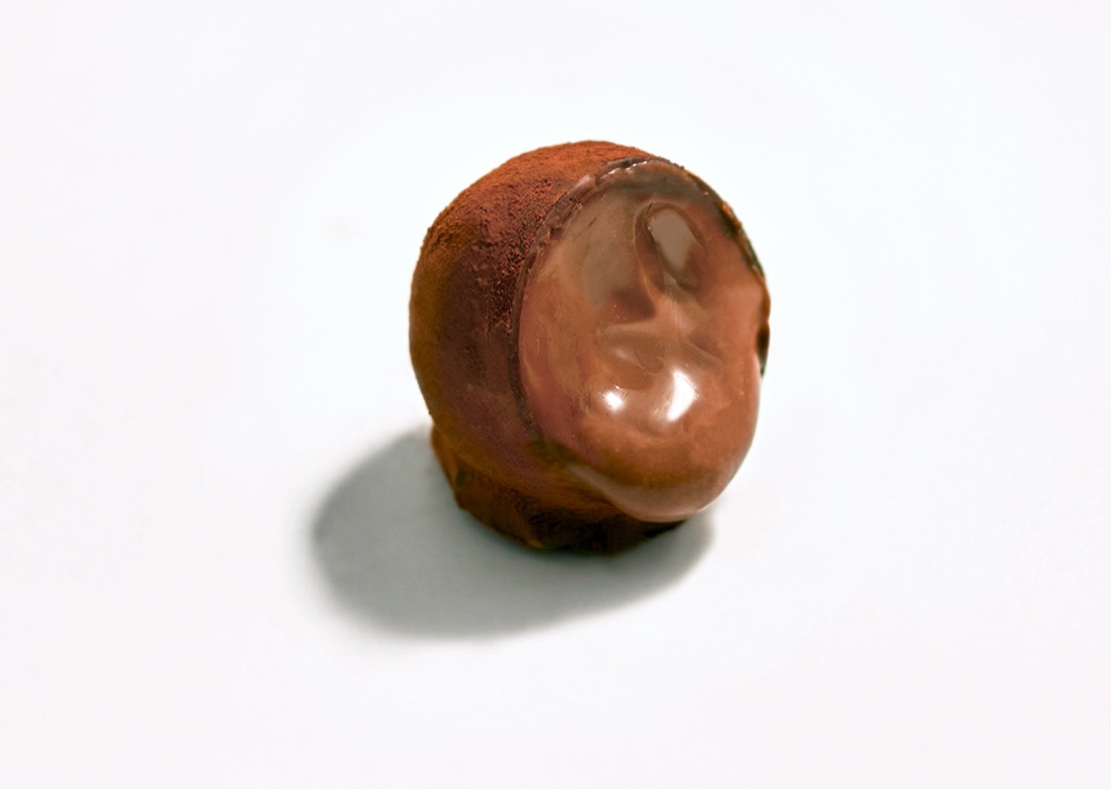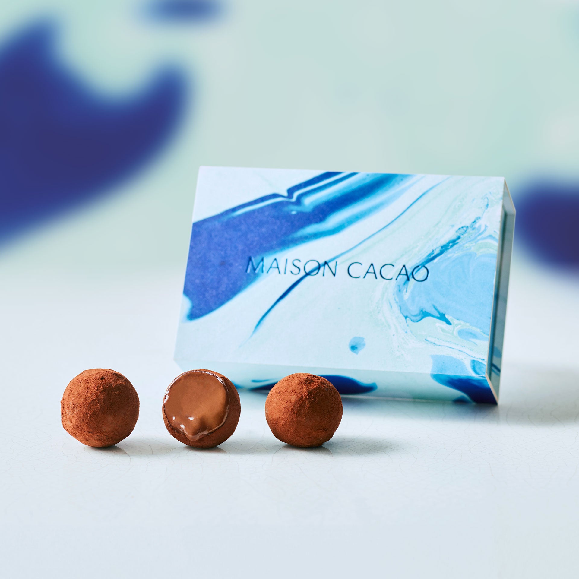外側のチョコレートは少し力を入れただけで割れそうなほど繊細ながら、口の中でパリッと弾けた瞬間に、中から液状のチョコレートが溢れ出します。それは出会ったことのない、驚きに満ちた体験。生チョコレートならではの食感、水分量、香りと味わいが表現された一粒をそっと指でつまんで、お召し上がりください。