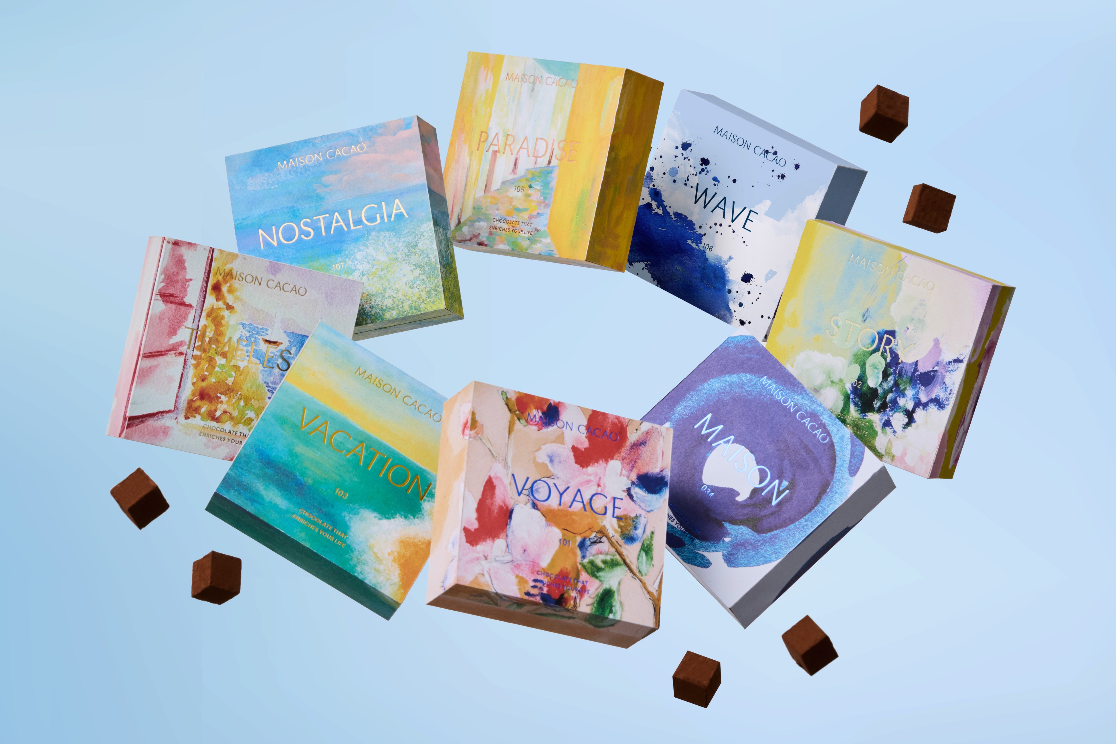 旅は、創業以来メゾンカカオのインスピレーションの源であり、訪れた土地の景色や香り、感情、味わいを一箱ずつに閉じ込めたコレクションです。旅先で出会った文化や素材から生まれた個性豊かな味わいを、まるで一つの旅を巡るように楽しんでいただけます。