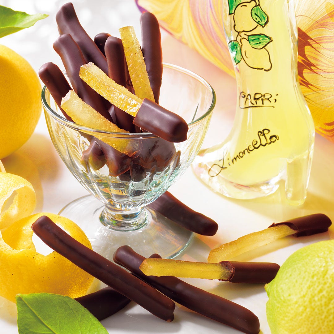糖漬けしたイタリア産レモンピールをイタリア産のレモンリキュール・リモンチェッロで香りづけし、ビタータイプのすっきりとしたチョコレートでコーティングしました。レモンピールのさわやかな香りがカカオのビターな風味と絶妙に調和します。
