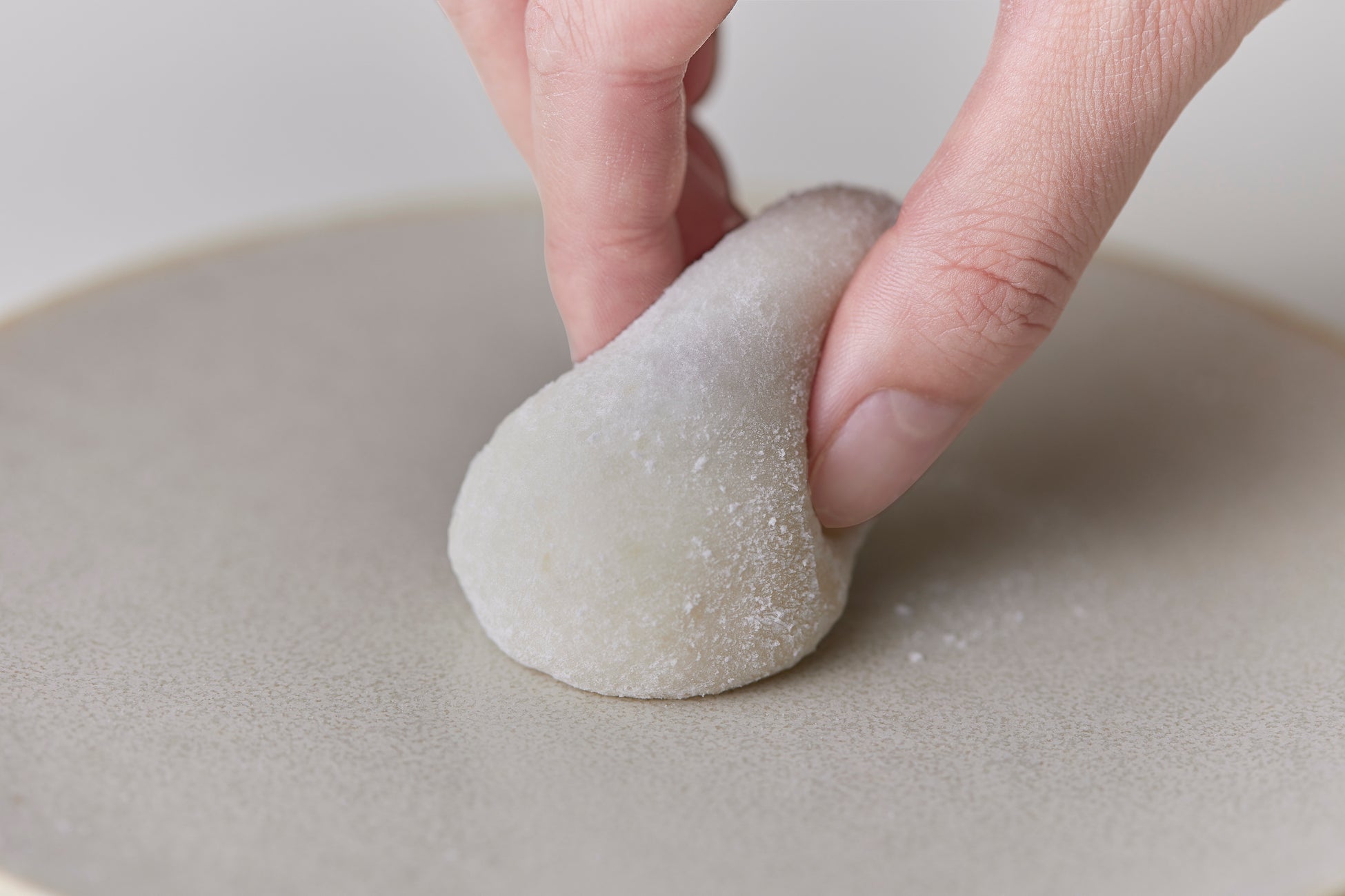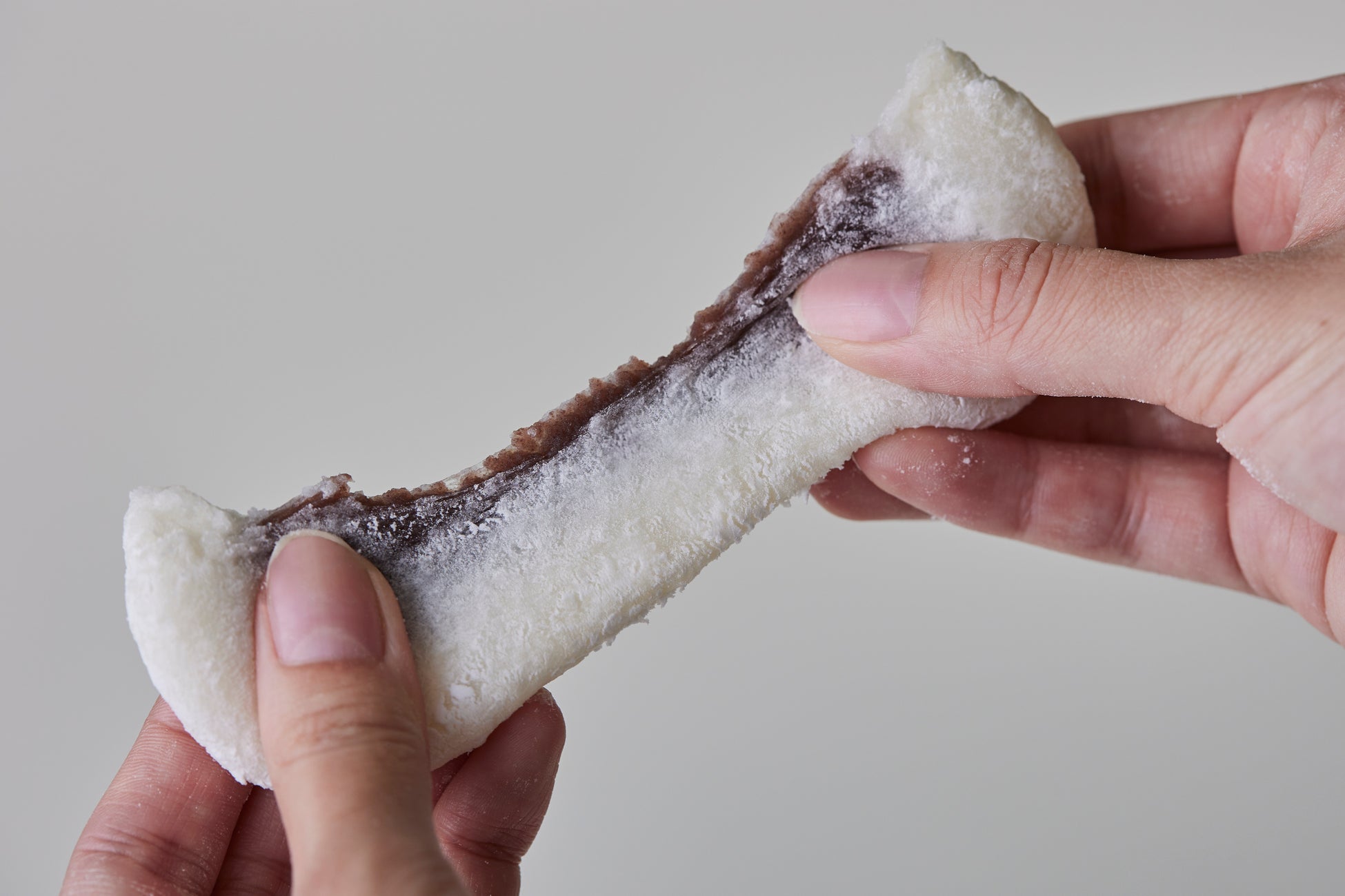 北海道産のもち米を使用した「やわ餅」。つきたてのお餅にメレンゲを加えることでやわやわもっちりな食感ととろける口溶けを実現。今回「生やわ餅 ショコラ」用のやわ餅にはチョコ感をプラスしてリッチに仕上げています。