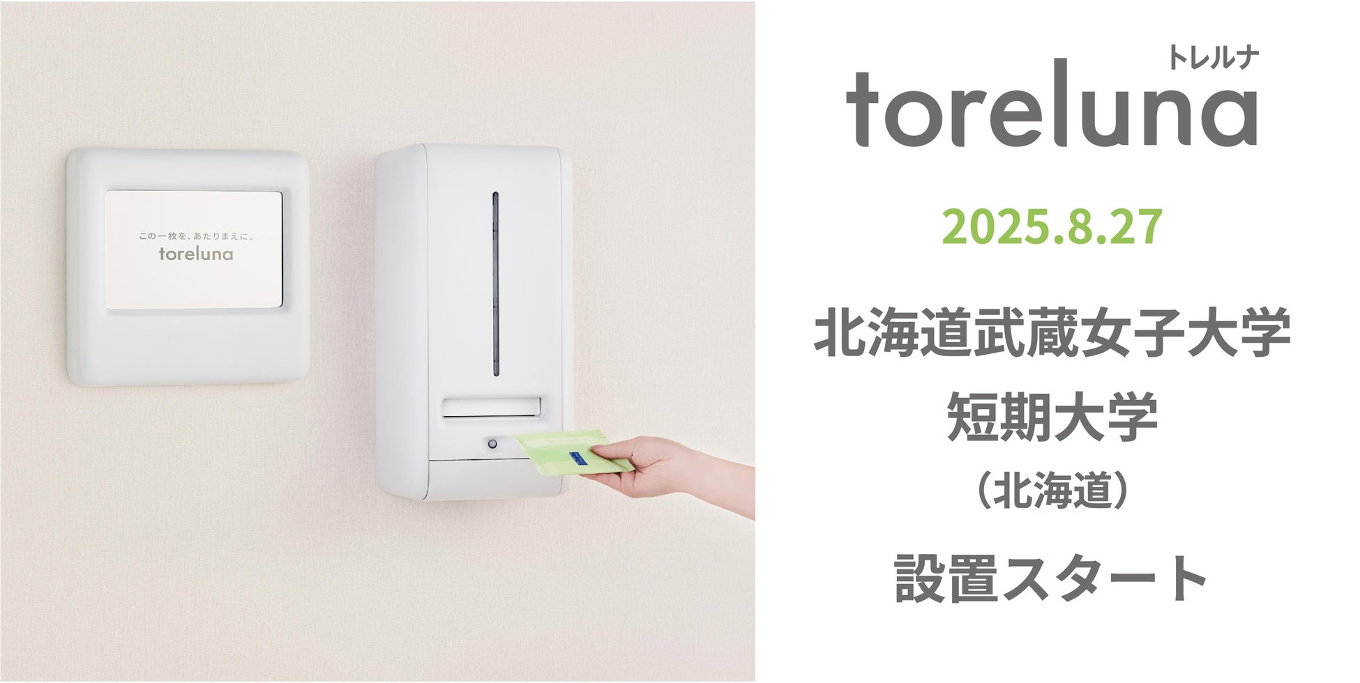 株式会社ネクイノ(大阪市北区、代表:石井 健一)は、トイレの個室で生理用ナプキンを常備し無料で提供するサービス「toreluna(トレルナ)」(以下 トレルナ)を、北海道武蔵女子大学/短期大学へ設置し、サービスの提供を開始いたしました。